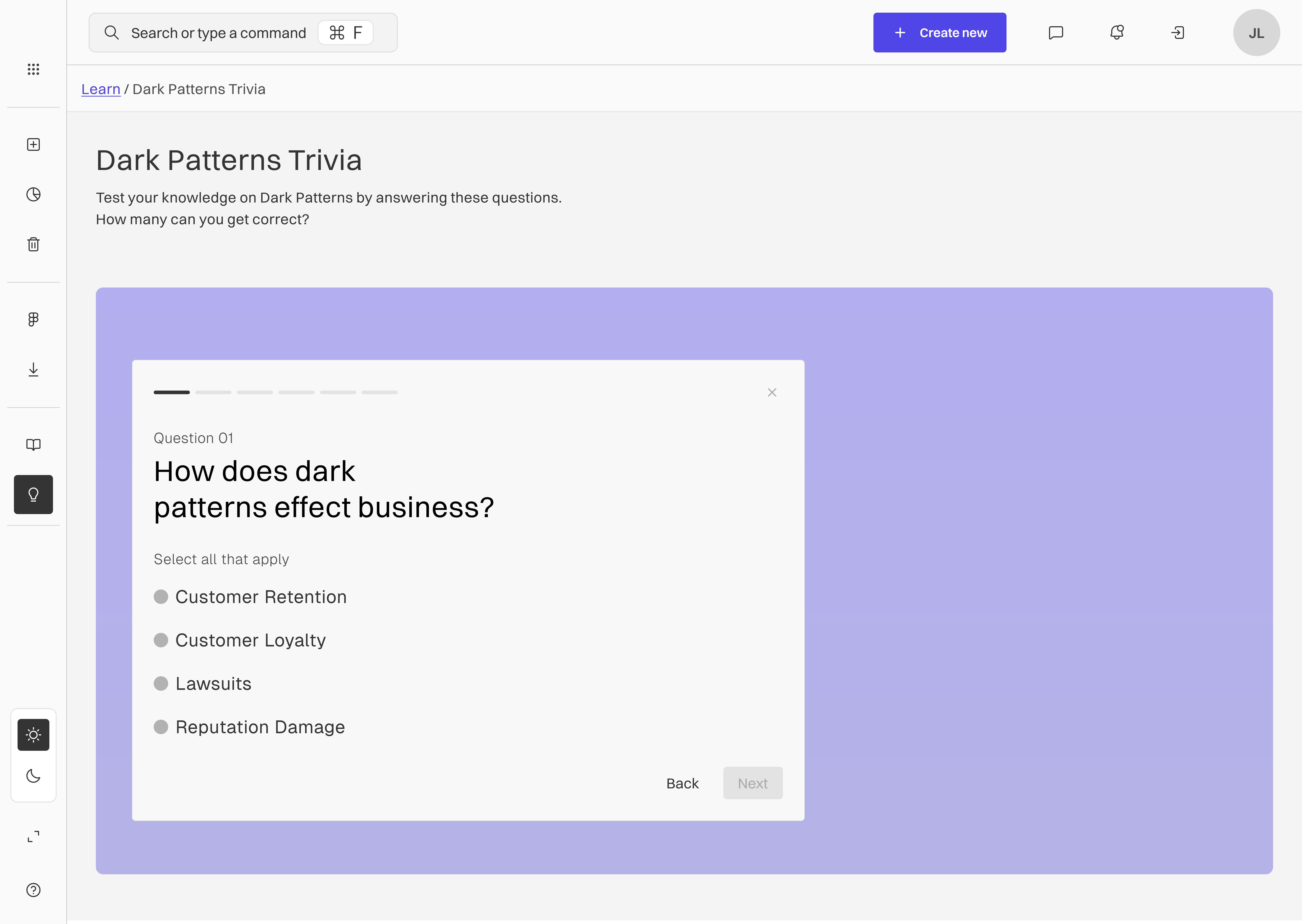 An example of the Learn feature inside the software. It supports our 'empower, don’t shame' principle by providing a fun, gamified approach to ethical design education.